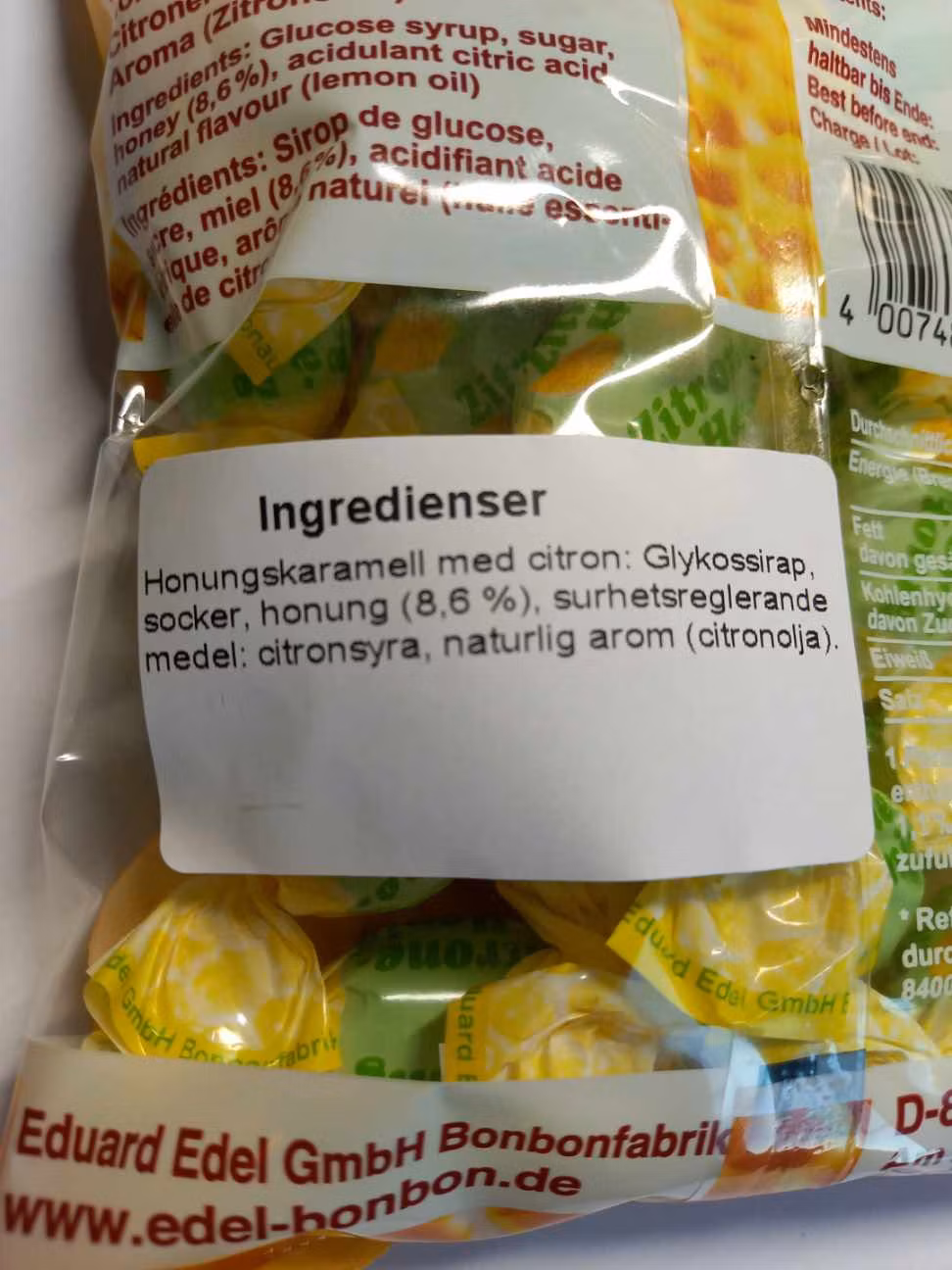 Inget vi tillverkar själva men ett absolut måste hos oss. Små underbara honungskarameller med citronsmak.